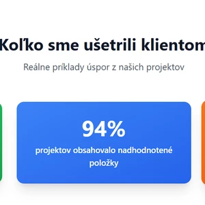 Až 94% stavebných rozpočtov obsahuje nadhodnotené položky - či už sú to produkty, ktoré sa v rozpočte opakujú 2 a viackrát, nesprávne čísla položiek, vysoké marže a podobne. Klientom často na rozpočte ušetrím v priemere 15-35%, v číslach je to len od mojich klientov v priemere 7 680 € na projekt.